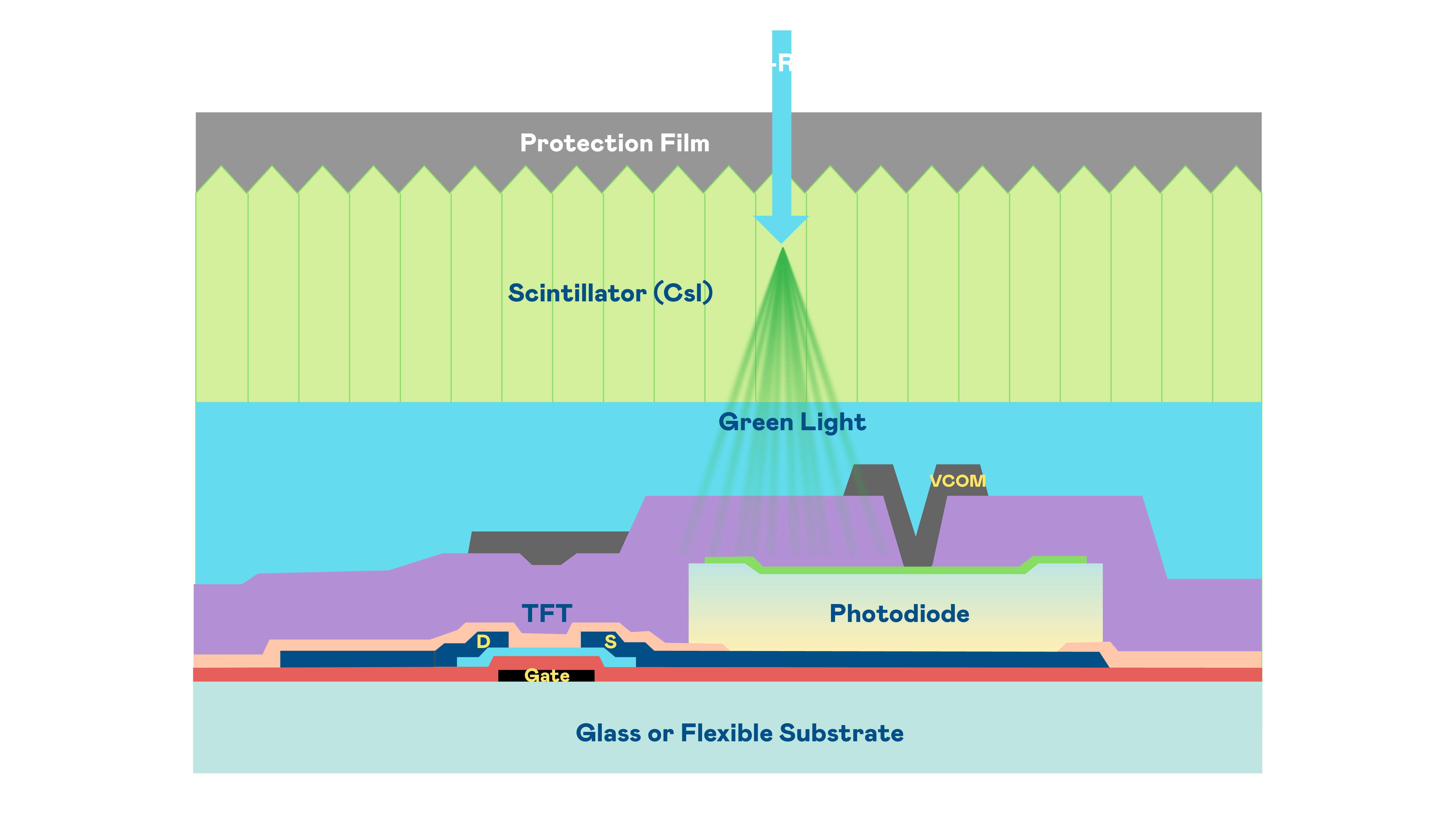 尊龙凯时国际的X光影像感测阵列使用薄膜电晶体 (TFT) 作为每个像素的读取开关,搭配光电二极体(Photodiode)的光电转换元件,用以感测X光影像讯号。